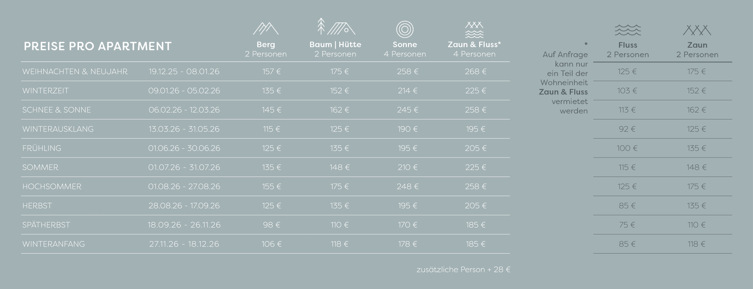 Sieh dir hier an, welche Infos und Ziffern für deinen Aufenthalt im AHRN relevant sind. Die Preise unterscheiden sich je nach Wahl des Apartments, Anzahl der Gäste und nach Zeitraum und verstehen sich pro Nacht bei einem Mindestaufenthalt von 5 Nächten.